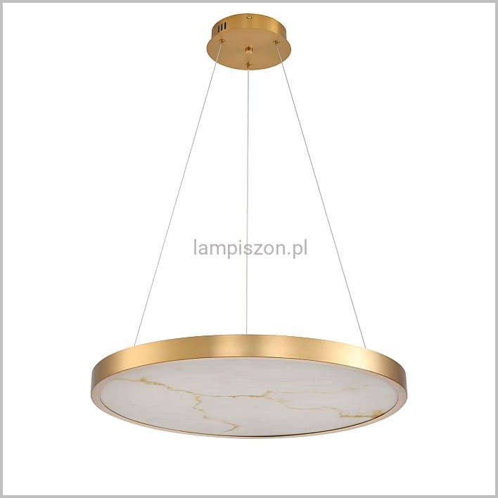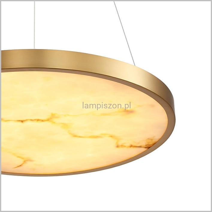ALCHEMY to stylowa lampa wisząca z kloszem z naturalnego alabastru. Klosz osłania ledowe źródło światła o mocy 49 watów. Średnica lampy to 60 cm. Oprawa lampy jest wykonana z metalu wykończonego w kolorze szczotkowanego złota i ma grubość 4 cm. Podsufitka, też wykończona w kolorze szczotkowanego złota ma średnicę 18 cm i grubość 4 cm.