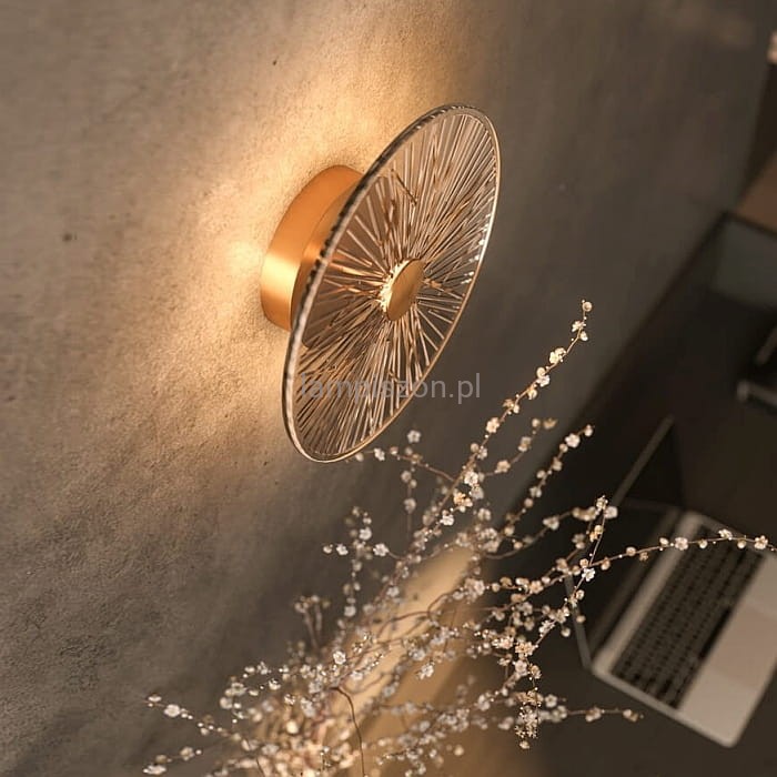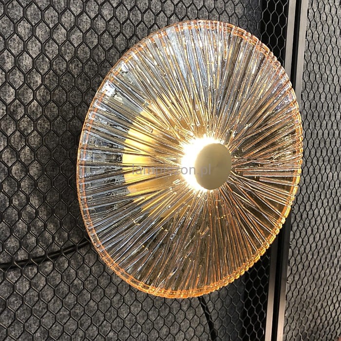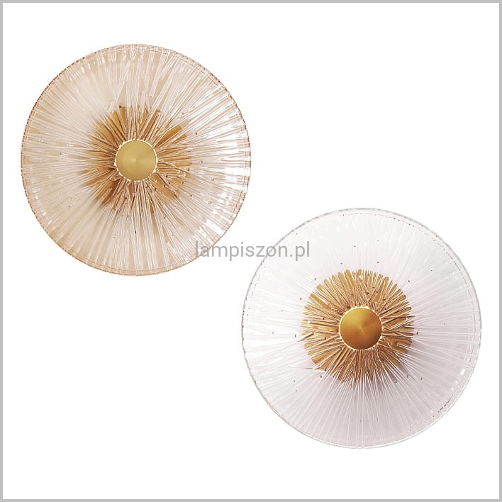 Kinkiet ALLURE 1L to dekoracyjna lampa LED, która swoim kształtem przypomina rozświetlony kwiat. Okrągły klosz o średnicy 28 cm jest wykonany z ryflowanego szkła w kolorze złoto bursztynowym lub bezbarwnego. Środek każdego okręgu stanowi koło z metalu w kolorze matowego złota.