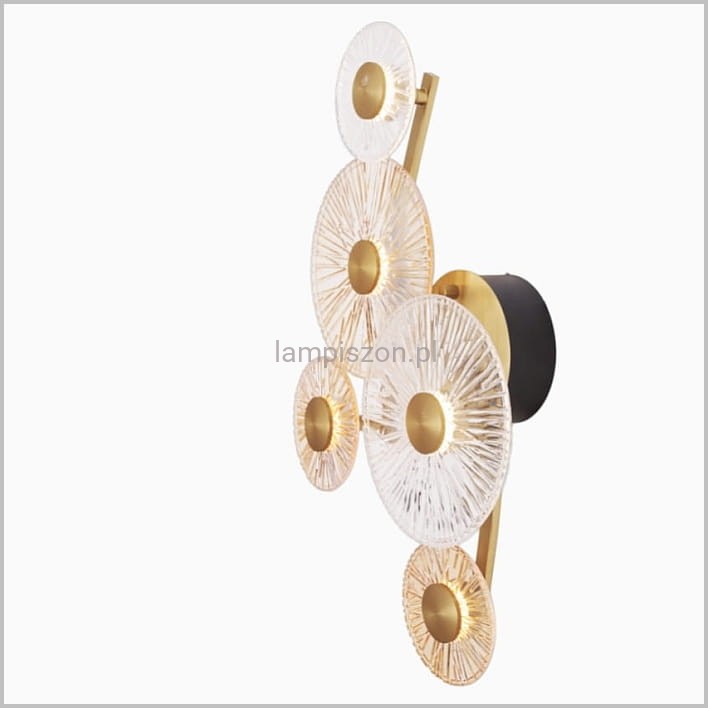 Kinkiet ALLURE wabi swoim wyglądem, łączy w sobie nowoczesność i tradycję. Pięć okrągłych tafli z dekoracyjnego szkła, podświetlonych LEDowymi źródłami światła daje wrażenie magicznego świecącego bukietu. Koła o dwóch różnych średnicach: 12 i 24 cm, są wykonane z bezbarwnego lub miodowego szkła. Odśrodkowy wzór szkła sprawia, że okręgi wyglądają jak kwiaty. Środek każdego kwiatu stanowią metalowe krążki w kolorze matowego złota.