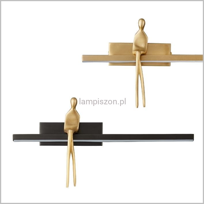 AMICI to niewielki designerski kinkiet, szerokość oprawy to 31 cm, a wysokość 17 cm. Kinkiet ma kształt półki-ławki w kolorze czarnym lub złotym, na której posadzono złotą postać wykonaną z mosiądzu.