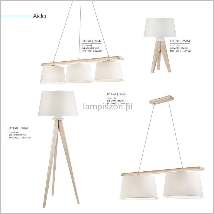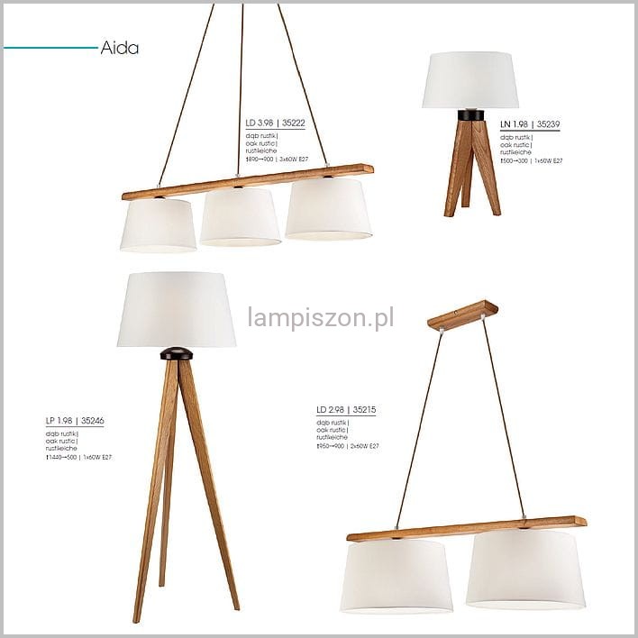Aida została wykonana z naturalnego drewna dębowego, wybarwiona w odcieniu orzecha. Półprzeźroczysta powłoka lakierobejcy uwydatnia słoje drewna i nadaje lampie charakter naturalny, rustykalny. Trzy białe abażury są wykonane z tkaniny o splocie płóciennym, od wewnątrz wzmocnione mleczną folią pcv. Drewniana podsufitka kryje w środku metalowy element montażowy.
