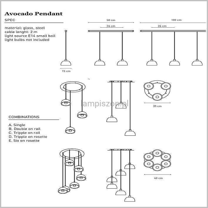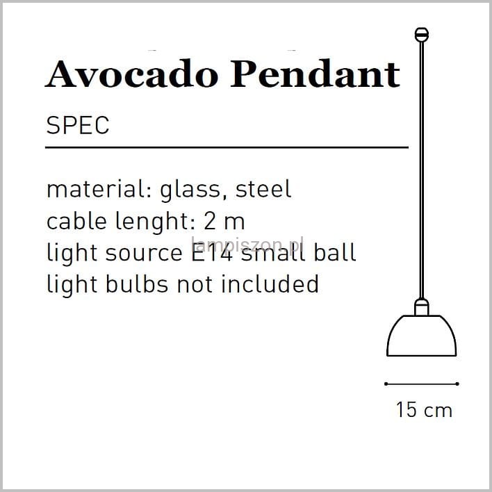 Szklana lampa wisząca Avocado Pendant firmy Tar swoim charakterem przypomina biżuterię. Może wisieć pojedynczo, lub w grupie. Klosz lampy wykonany ręcznie ze szkła krośnieńskiego występuje w trzech kolorach: srebrnym, złotym i kryształowym. Klosz ma średnicę 15 cm i wysokość 14 cm. Długość oprawy maksymalna 2m, regulowana przed montażem. Lampa przystosowana do jednej żarówki LED E14. Ta wisząca lampa może być użyta jako źródło nastrojowego światła nad stołem jadalnym czy stolikiem do kawy lub jako przyciągający uwagę element wystroju.