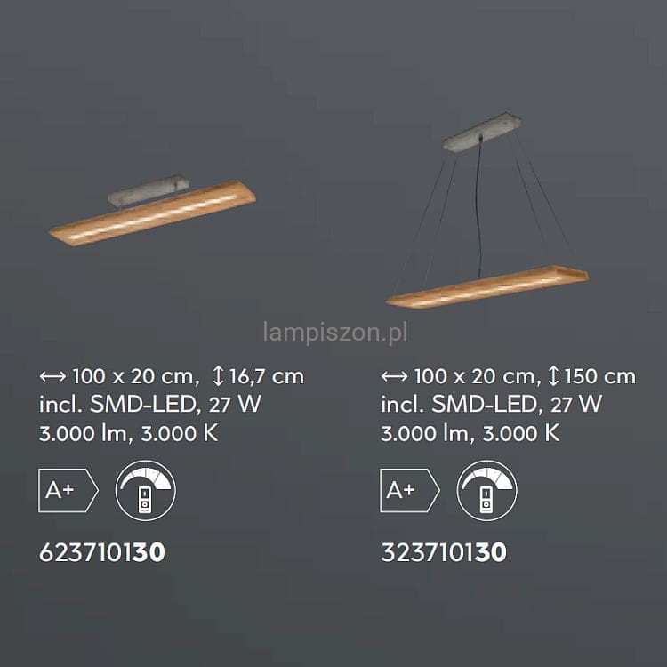 Oprawa jest wykonana z naturalnego drewna i metalu wykończonego w szaro srebrnym kolorze. Jest wyposażona w źródło światła SMD LED o mocy 27W dające światło 3000lm o ciepłej białej barwie 3000K.