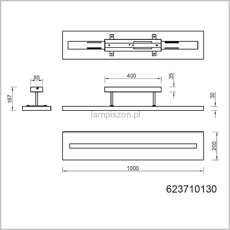 Brad 623710130 to oryginalna lampa sufitowa, ma w sobie coś z plafonu i coś z lampy wiszącej. Lampa Brad jest duża podłużna, a więc nadaje się do pomieszczeń prostokątnych, takich jak kuchnia, korytarz, albo do jadalni nad stół. Brad ma długość 1 m i szerokość 20 cm, cała wysokość od sufitu to 17 cm, a więc lampa sprawdzi się także w niezbyt wysokich pomieszczeniach.