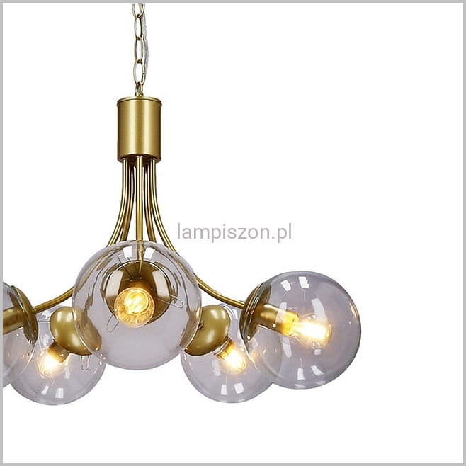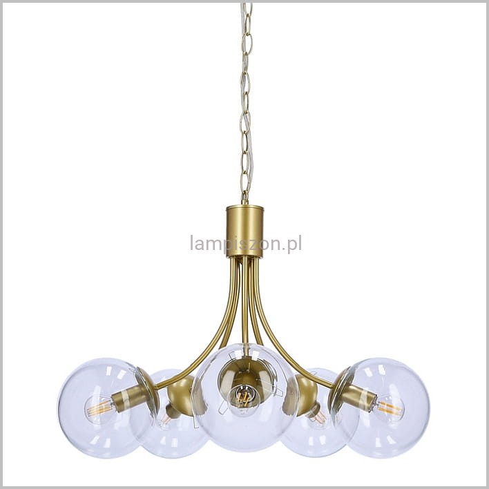 Podstawa lampy i łańcuch, na którym jest zawieszona, są wykonane ze stali lakierowanej w kolorze matowego złota. Dookoła łańcucha jest poprowadzony transparentny przewód zasilający. Pięć kloszy z transparentnego szkła kryje w sobie gniazda na żarówki LED na gwincie E14.