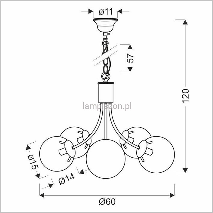 Średnica oprawy to 60 cm, wysokość całej lampy to 120 cm. Montując lampę można skrócić łańcuch tak, że cała oprawa będzie miała wysokość około 65 cm. Szklane klosze o średnicy 15 cm mają kształt otwartych kul, co ułatwia wymianę żarówek.