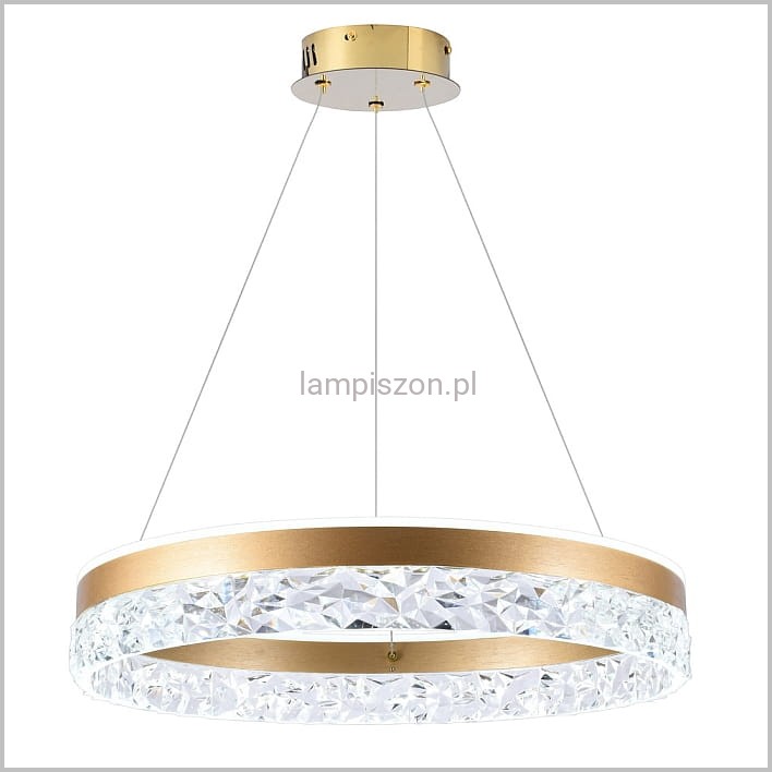Żyrandol FROZI to oprawa dla miłośników elegancji, luksusu, stylu glamour. Takie wrażenie sprawia połączenie złotego matowego wykończenia oraz efektownych kryształków ze szkła akrylowego. Lampa jest wyposażona w energooszczędny moduł LED o mocy 32 W emitujący białe ciepłe światło 3000K. To dobre rozwiązanie zarówno do wnętrz nowoczesnych, jak i tradycyjnych. FROZI najlepiej sprawdzi się jako oświetlenie nad stołem jadalnianym, ale można ją też zastosować w innych pomieszczeniach mieszkalnych, takich jak salon, hol lub sypialnia.