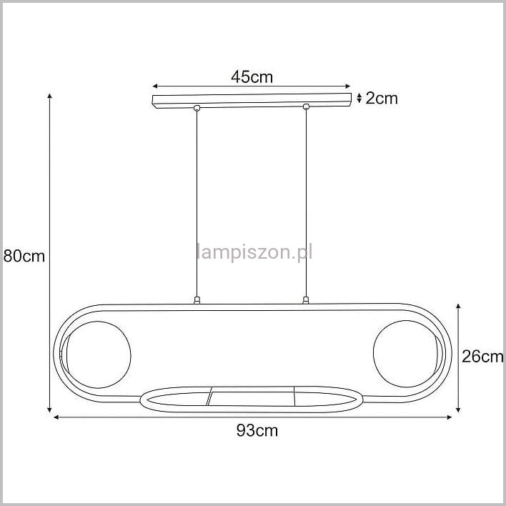 Lampa Finestra Kaja ma szerokość 93 cm, wysokość maksymalna to 80 cm. W trakcie montażu można lampę skrócić nawet do około 35 cm, ale wówczas półka może okazać się mało funkcjonalna. Wybierając lampę Finestra trzeba się zaopatrzyć w 2 żarówki na dużym gwincie E27.