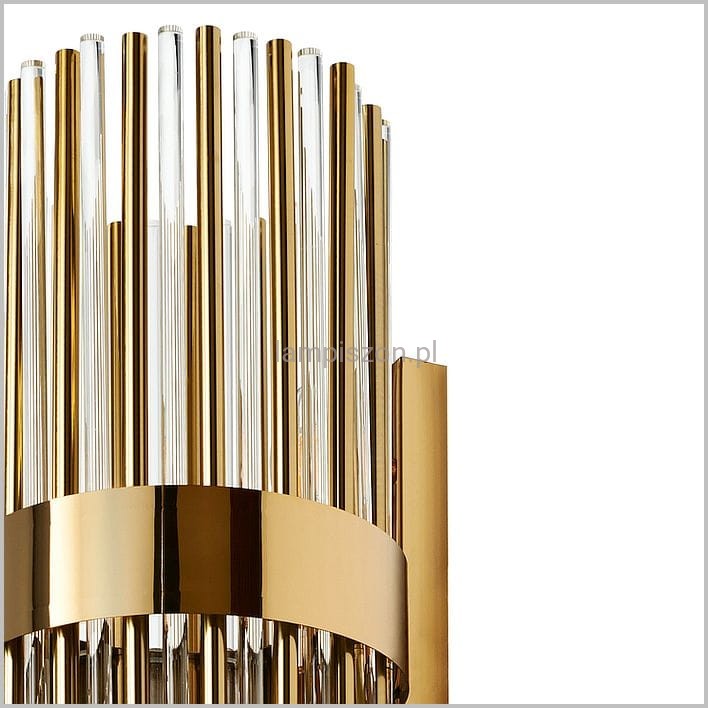 Kinkiet LAGO to harmonijna kompozycja kryształowych oraz złotych metalowych rurek. Nietuzinkowa forma lampy może uzupełnić zarówno wnętrza klasyczne jak i nowoczesne. Duża precyzja wykonania zadowoli osoby ceniące sobie szyk i ponadczasową elegancję.
