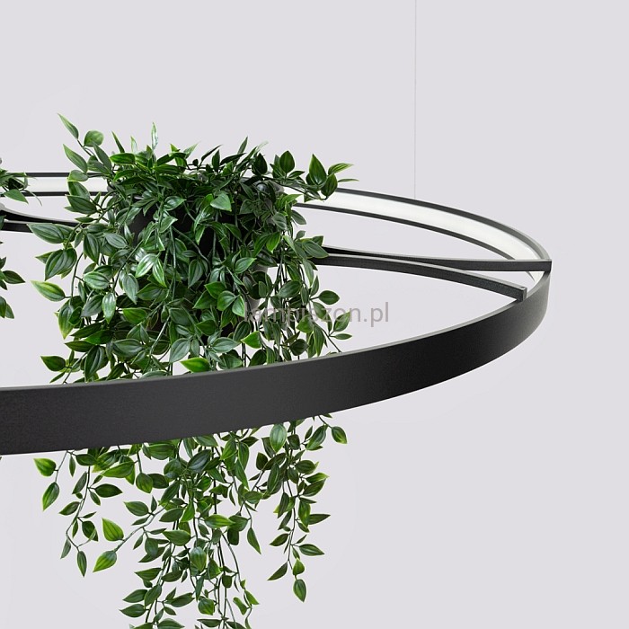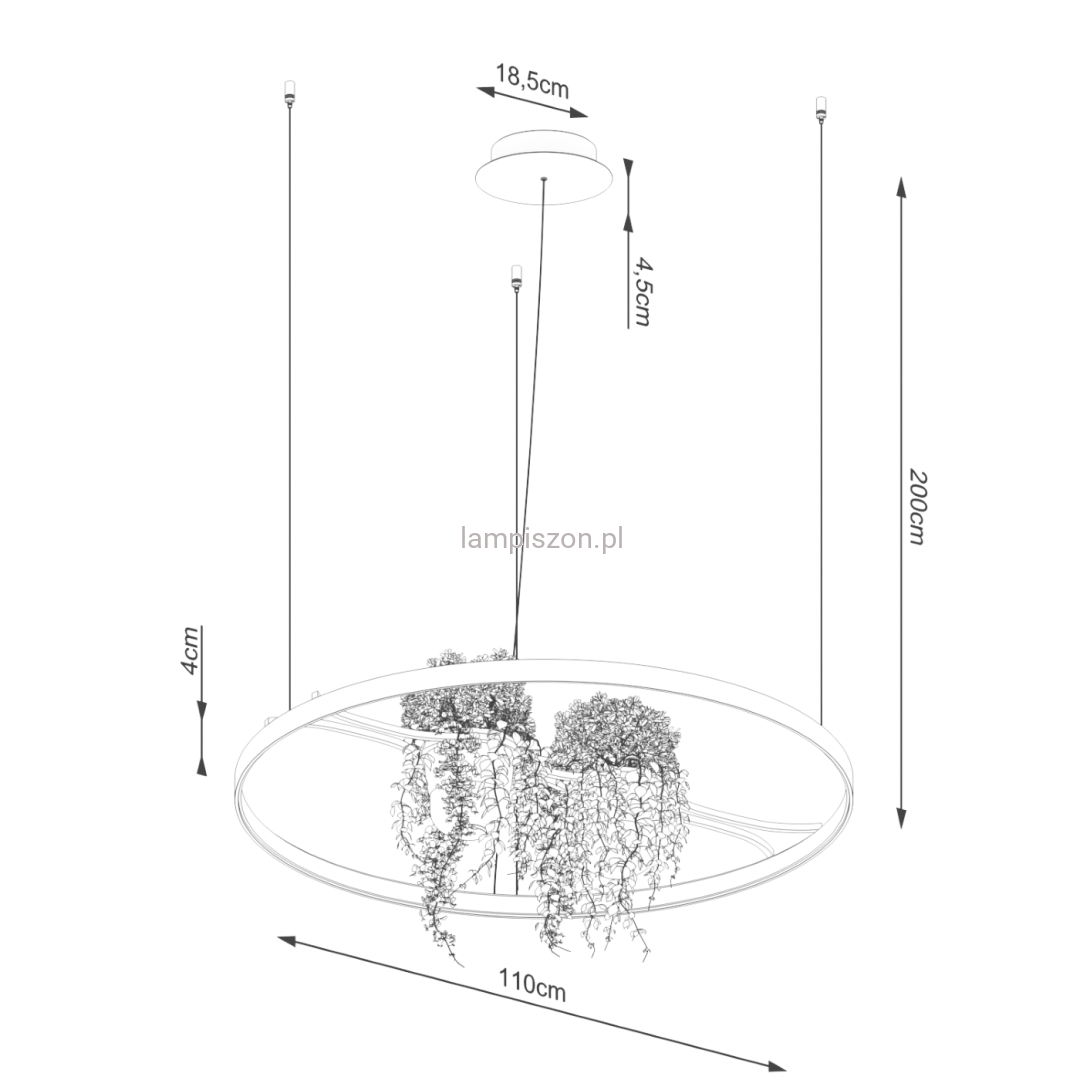 Lampa wisząca RIO BIO ma średnicę 110 cm i wysokość aż 200 cm, którą oczywiście można zmniejszyć w czasie montażu. Oprawa jest wykonana ze stali lakierowanej w kolorze czarny mat i waży 5,3 kg. Jeżeli umieścimy w niej doniczki z ziemią i naturalną zielenią, należy przewidzieć zwiększony ciężar i zastosować odpowiedni sposób zawieszenia.