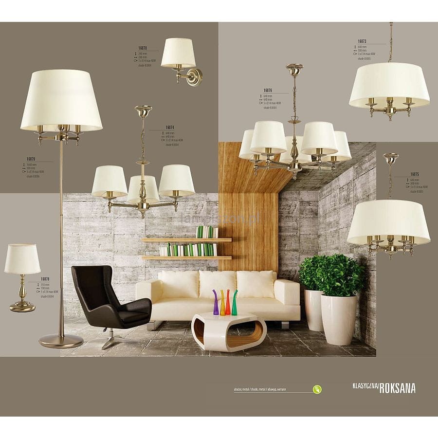Roksana to stylowy żyrandol trójpłomienny zaprojektowany z myślą o tradycyjnych salonach i jadalniach. Żyrandol ma duży 50 cm abażur z jasnej tkaniny w odcieniu ecru. Poniżej abażura jest widoczna ozdobna konstrukcja lampy z charakterystycznym dla kolekcji Roksana detalem rozety.