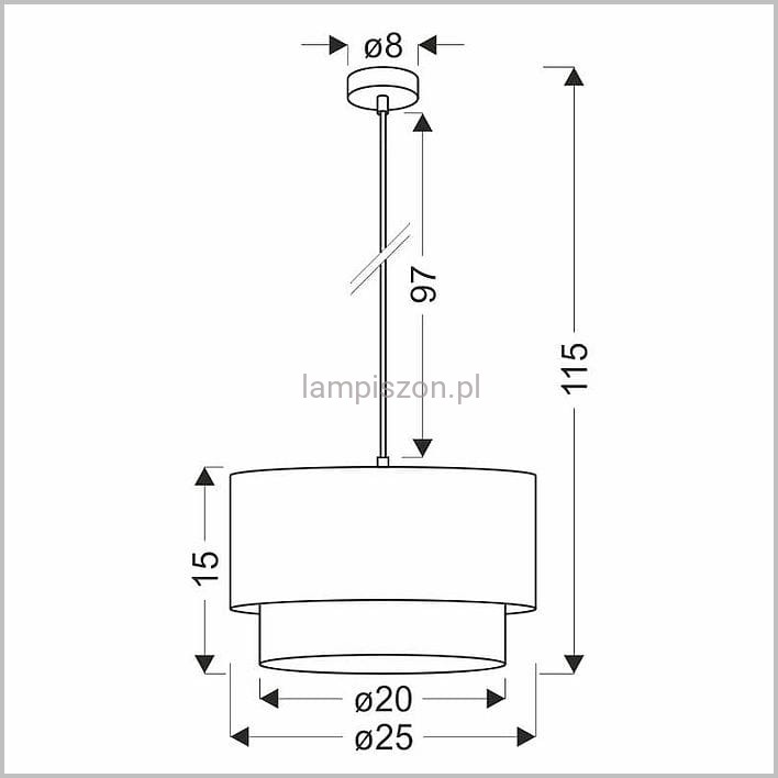 Abażur lampy Sferia ma średnicę 25 cm i wysokość 15 cm, długość całej lampy to 115 cm i można ją zmniejszyć w trakcie montażu. Lampa jest zaprojektowana na żarówkę E27 na dużym gwincie.