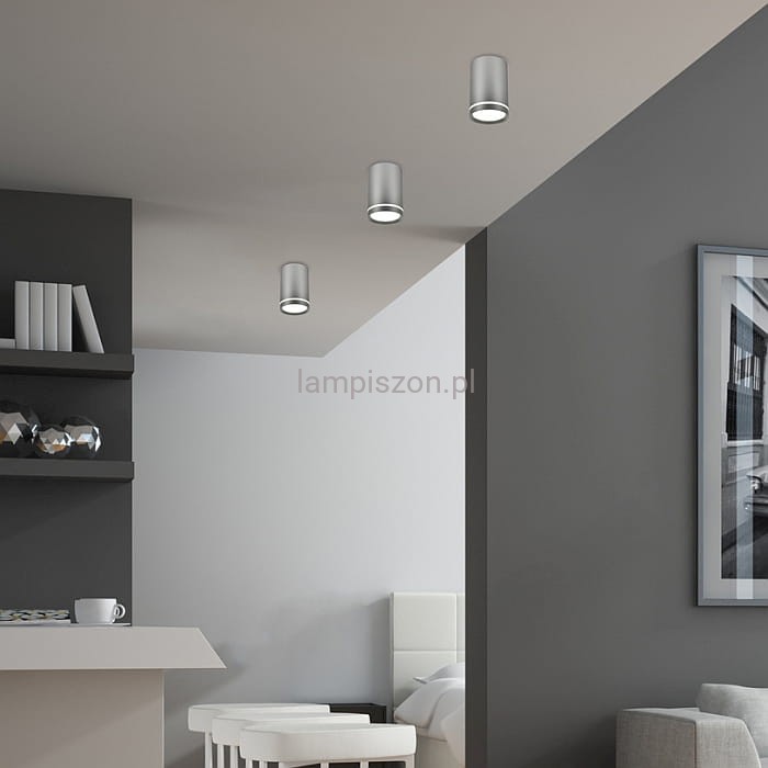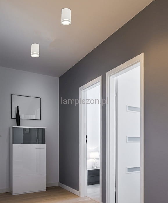 Lampa sufitowa w kształcie tuby o wymiarach: średnica 6,8 cm i wysokość 10 cm, wykonana z aluminium. Oprawa świeci światłem skierowanym w dół, ale dodatkowo biały pasek na oprawie to wąziutki klosz-pierścień przez który również wydostaje się światło. Kupując lampę należy się zaopatrzyć w żarówkę GU10 LED o odpowiedniej do wnętrza barwie światła ciepłej, neutralnej lub zimnej.