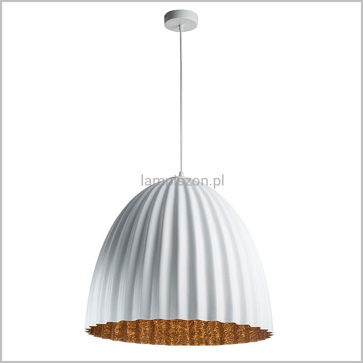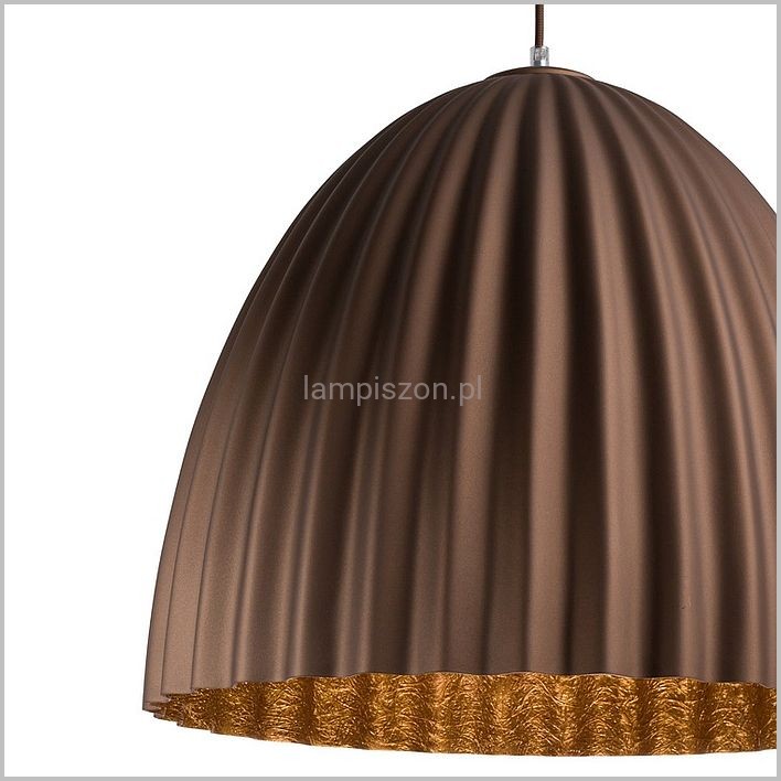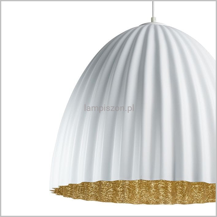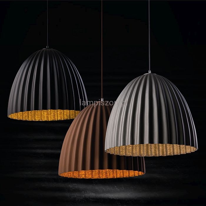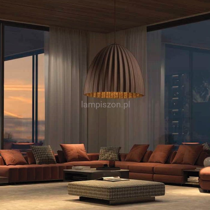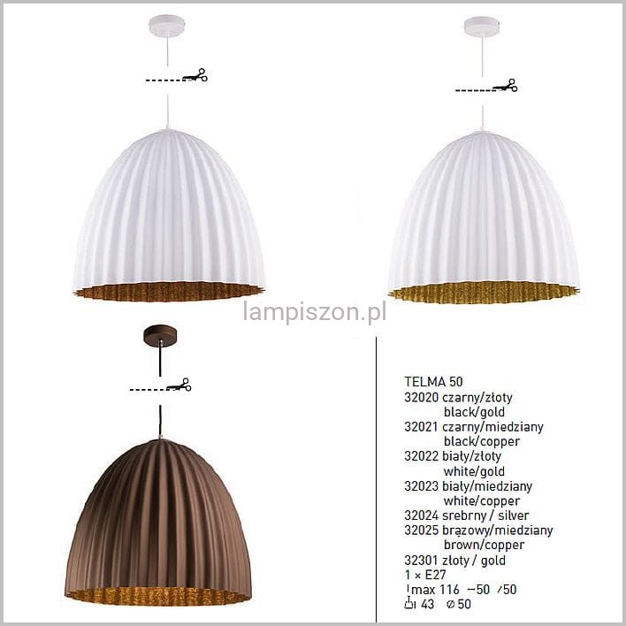 Karbowany klosz Telmy został wykonany z kompozytu mineralnego i ma średnicę 50 cm. od zewnątrz ma gładką satynową powierzchnię, od wewnątrz widać strukturę charakterystyczną dla kompozytu wykończoną w kolorze złota lub mosiądzu. Klosz ma wysokość 43 cm, a długość całej lampy to maksymalnie 116 cm, można ją skrócić przy montażu oprawy. Telma jest dostosowana do żarówki E27 na dużym gwincie.