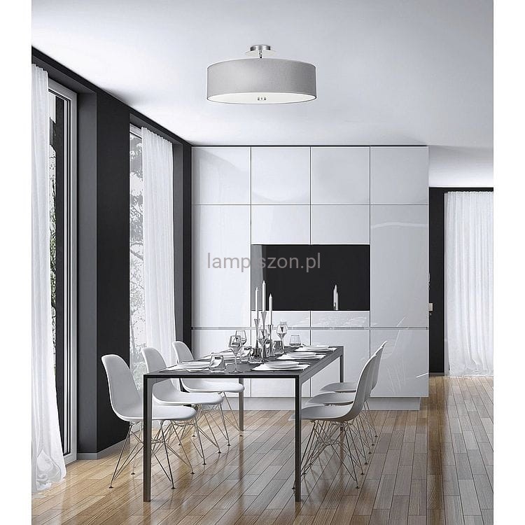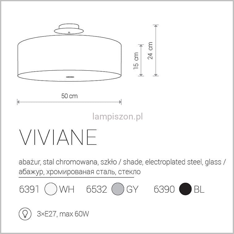 Abażur lampy ma średnicę 50 cm i wysokość 15 cm. Wysokość całej lampy to 24 cm. Elementy metalowe są wykonane ze stali chromowanej. VIVIANE jest produkowana z abażurem w kolorze białym, szarym lub czarnym - wybrany kolor proszę opisać w uwagach do zamówienia